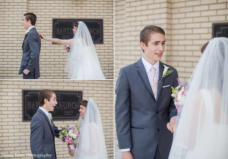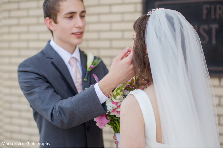 First, what is a first look? Call it a trend, but it’s a newer thing in wedding photography where the bride and groom see each other, fully wedding-ready, before the ceremony. It’s a private moment, and I usually set it up where the groom is facing away from the bride, she comes up and taps him on the shoulder, and he turns around to see her for the first time. I do take pictures during this time, but I also give my couples a few undirected minutes to just enjoy each other before we move into couple portraits.