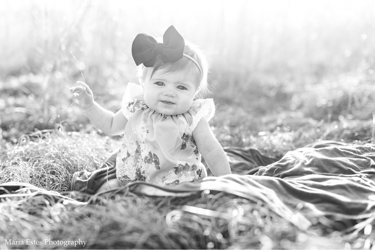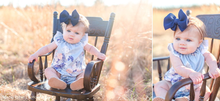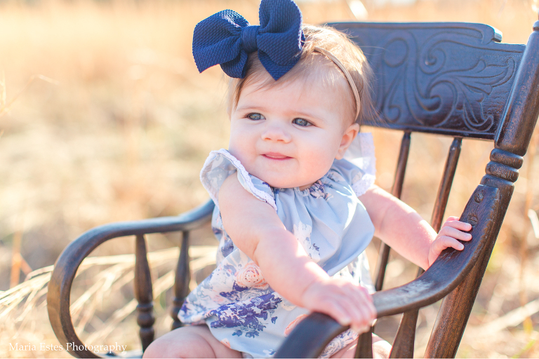 This little girl has the prettiest blue eyes you ever did see. When her mom asked about doing a 6-month session I couldn’t wait! We had to patiently watch the weather since it’s been SO rainy, but we got lucky last weekend with a sunny day and a high of 65! Now 65 isn’t THAT warm for an infant, but we made it work. And her little blue romper and bow are just adorable!! I also love the rocking chair and old crate her mom brought. They were perfect for our barn/field setting. If you remember, this is the same barn/field I did the Watkins family‘s photos at back in November. It’s quickly becoming a favorite spot!